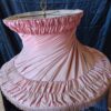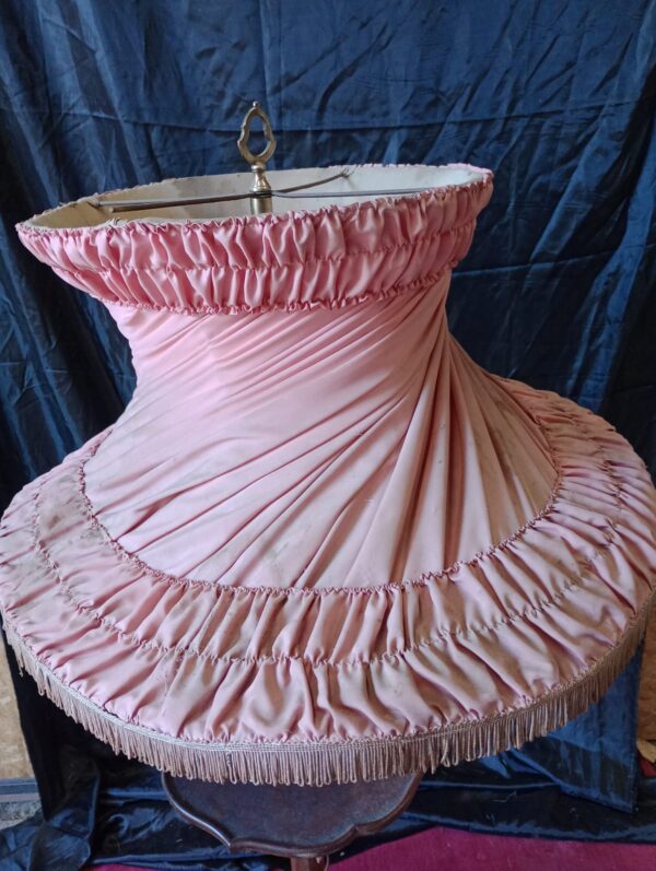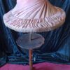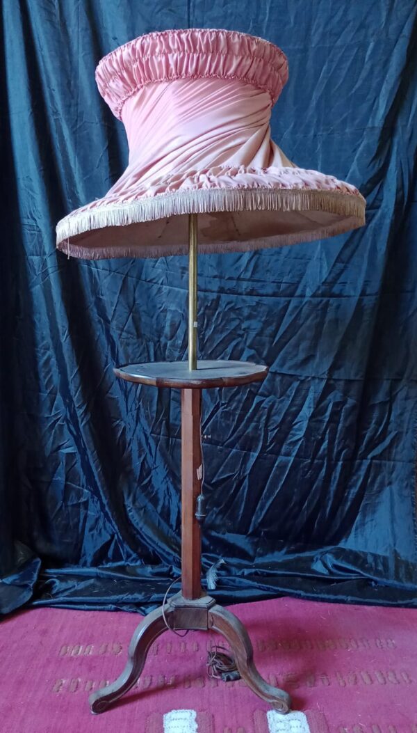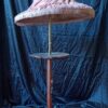 Con pantalla plisada color rosa y mesa integrada en el soporte central.